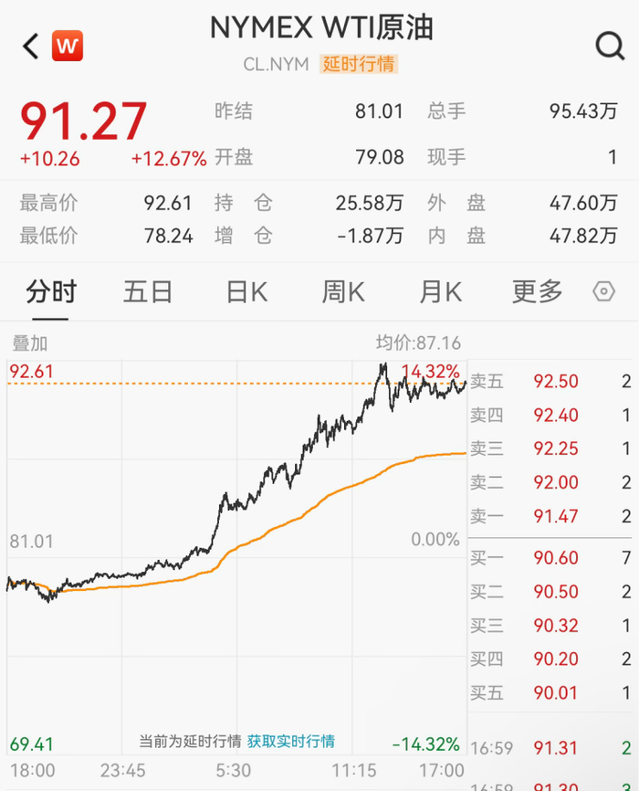 昨夜今晨,受地缘冲突等影响,国际原油价格再次直线飙升。WTI原油站上92美元/桶,暴涨12.67%,布油价格站上94美元/桶,涨逾9%