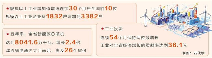 工业投资连续54个月保持两位数增长,工业对全省经济增长的贡献率达到36.1%;规模以上工业增加值增速连续30个月居全国前10位;规模以上工业企业从1832户增加到3382户……