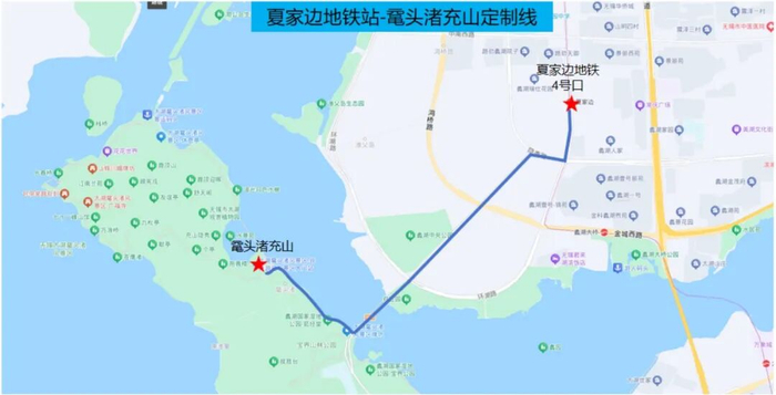 线路详情:由地铁4号线夏家边站(4号口)出发,一站式直达鼋头渚(充山大门)。