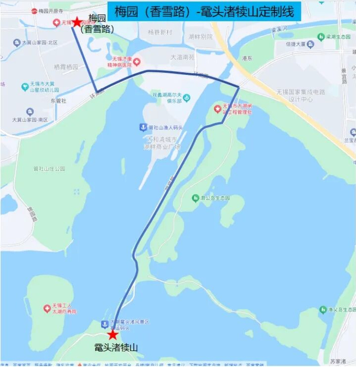 线路详情:由香雪路梅园站南侧临时站发车,直达鼋头渚(犊山大门)。