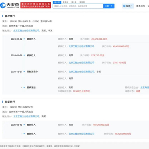 此外,董璇名下北京艺璇文化经纪有限公司现存一则恢复执行信息,执行标的4942万元,执行法院为北京市第一中级人民法院,涉及浙江唐德影视股份有限公司与北京艺璇文化经纪有限公司、高云翔相关演出合同纠纷案件。