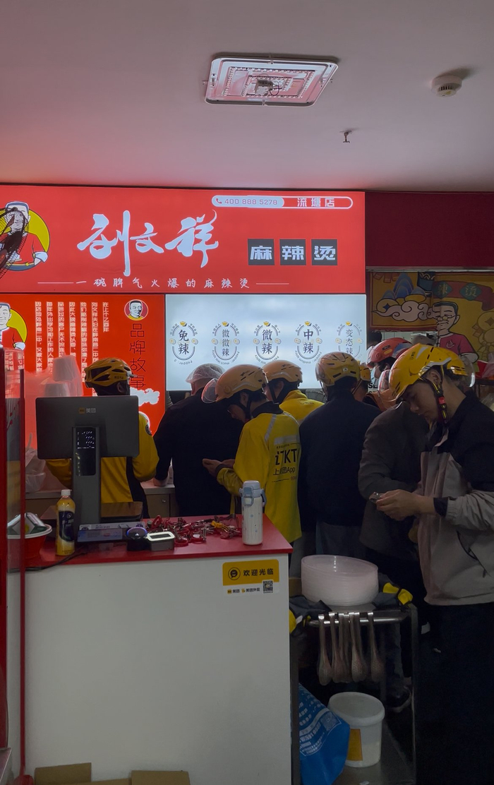 爆单后的刘文祥麻辣烫,门店里挤满了等待出餐的骑手。
