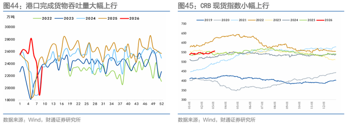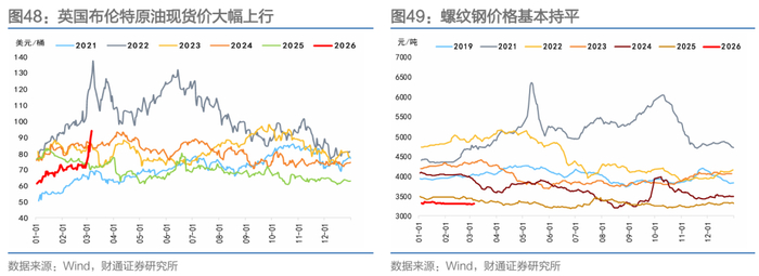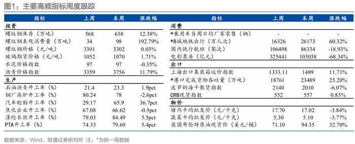 投资生产方面,商品价格表现分化。螺纹钢价格基本持平,需求边际回暖,库存累积;水泥价格小幅下降,节后稳步恢复,需求温和回升;玻璃期货价格上升,库存长假后累库;沥青价格大幅上升,主要受成本端支撑。