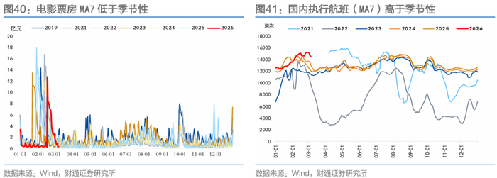 消费方面,地铁出行符合季节性,国内执行航班高于季节性,电影票房、汽车零售低于季节性。