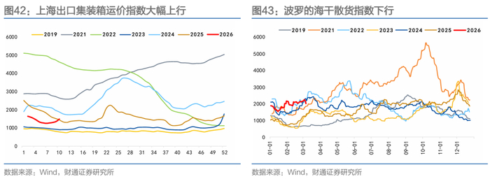 出口方面,本周SCFI上行,BDI下行。本周北美航线,运输需求偏弱,市场运价继续上行。