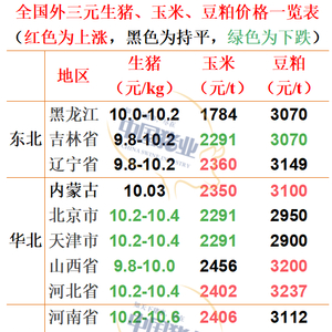注:“红色字体表示涨、绿色字体表示跌、黑色字体表示与前一日持平”,数据来源于“猪小二”、行情宝,生猪的价格为“元/kg”,玉米、豆粕价格单位为“元/t”,此价格为生猪成交价格,仅供参考。