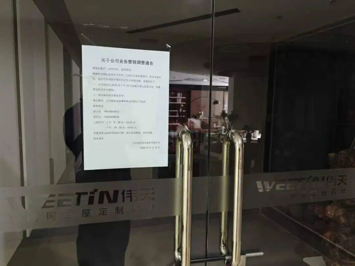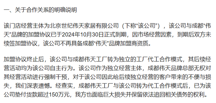 公开资料显示,伟天家居总部位于成都,主打全屋定制业务,线上渠道布局较多。另据媒体此前报道,伟天家居集团曾发布声明称,北京伟天的加盟关系已于2024年10月到期。