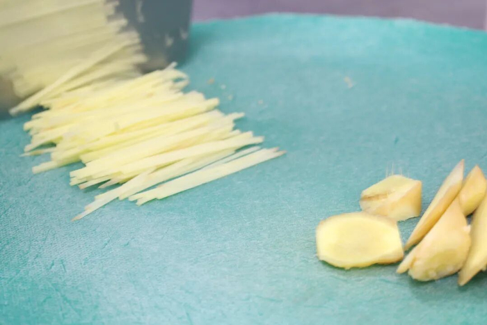 1.马蹄、生姜、小葱分别切末(其中,生姜、葱,留少许切段)