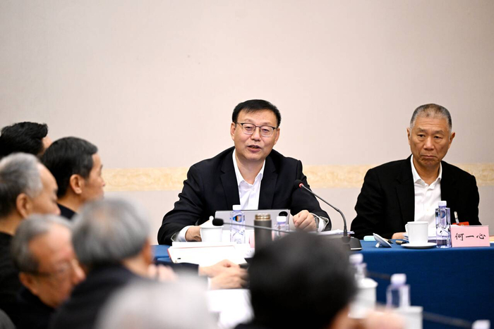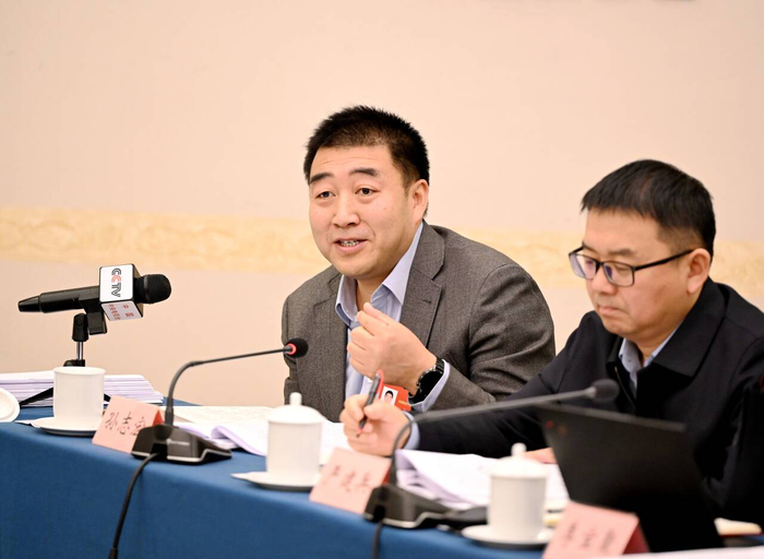 3月7日,全国政协委员曹金山(右二)建议,统筹推进农田水利设施提档升级,将排水系统建设纳入高标准农田建设核心指标,实现灌溉与排水设施同步规划、同步建设、同步验收。草原云记者 韩卿立 摄
