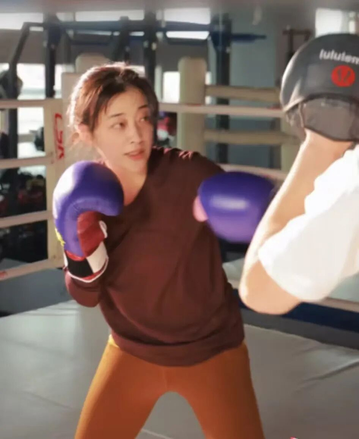 随后,她登上拳击台,眼神犀利、气场全开,用力挥舞拳头。