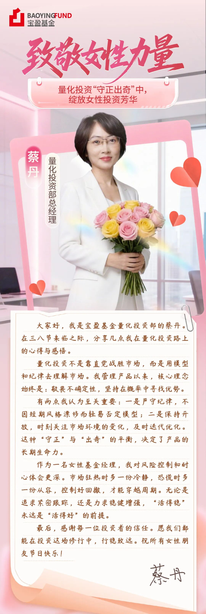 值此三八国际妇女节之际,宝盈基金特别推出《她视角下的投资》专题,邀请四位女性掌舵人——蔡丹、宋芳、吕姝仪、阳之璇,从不同投资赛道出发,分享她们的实战心得、心路历程与女性视角的独特价值。