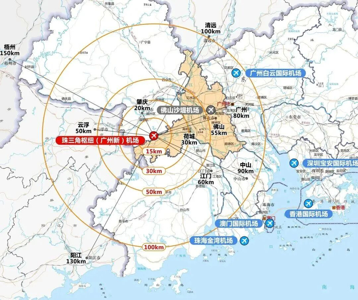 广州第二机场,不在广州,而是落在都市圈的佛山与肇庆交界之地,以珠三角枢纽(广州新)机场为定位,属于广州国际航空枢纽的一部分。