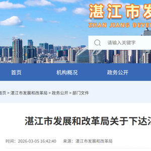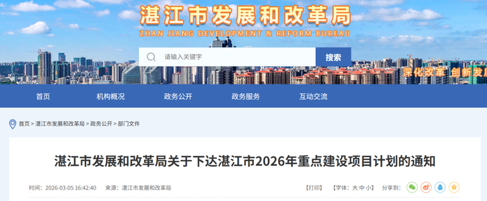 3月5日,广东省湛江市发展和改革局发布《关于下达湛江市2026年重点建设项目计划的通知》。
