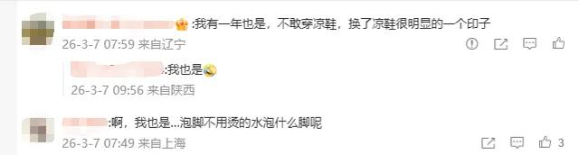 事件曝光后,网友也纷纷分享自身经历。有网友坦言:我有一年也是不敢穿凉鞋,很明显的一个印子”,也有网友猜测是低温烫伤,还有网友疑惑:可能是她泡脚药的药渍,就跟茶杯的茶渍一个道理