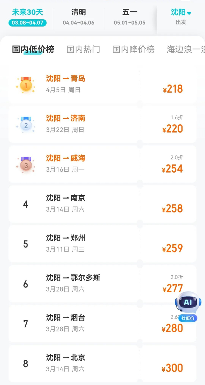 前往青岛、济南、威海、南京等地的机票价格,