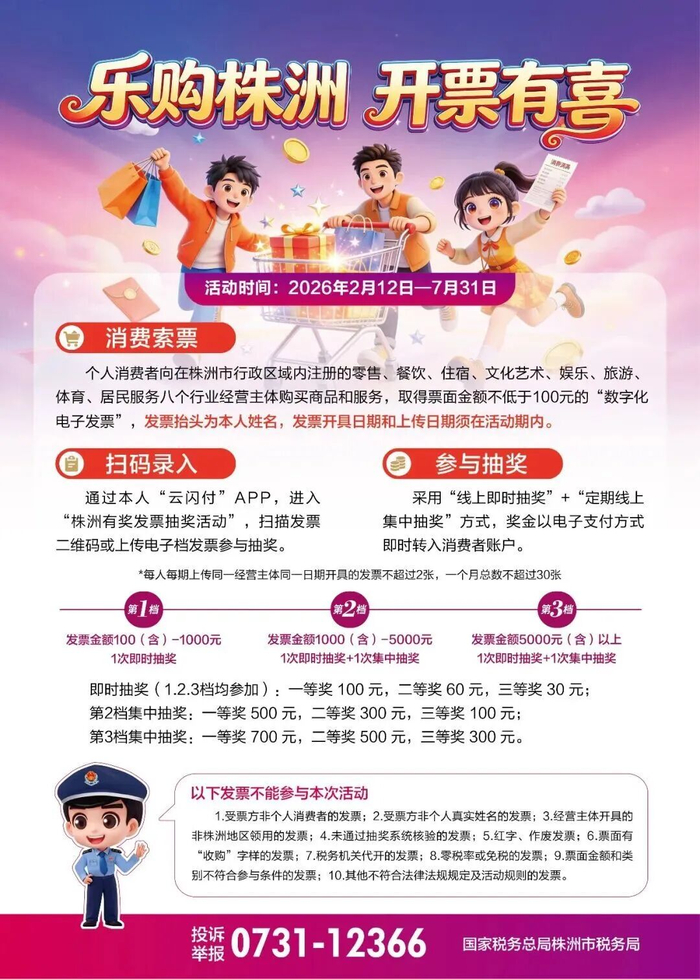 为进一步激发消费需求、释放消费活力,财政部、商务部、税务总局发文明确,在全国50个城市开展有奖发票试点工作,政策实施期为6个月。其中,株洲、湘潭成功获批国家有奖发票试点城市,中央财政给这两个地方,安排了总共约3亿元的资金,将全部回馈给消费者。