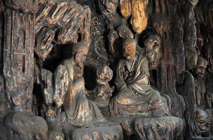 寺内唐代“塑圣”杨惠之所塑的十八尊罗汉像(现存九尊)是镇寺之宝。1928年大殿坍塌半数被毁后,蔡元培、顾颉刚等学者发起抢救,1932年建成古物馆保护幸存罗汉。塑像采用“塑壁”技法,将山水浮雕与立体造像融合,人物形象气韵高古却又流动着人间温情,衣服褶皱灵动飘逸,意蕴绵长,布局方面尤见巧思,可谓匠心独运。