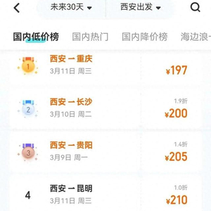 前往重庆、长沙、贵阳、昆明等地的机票价格,