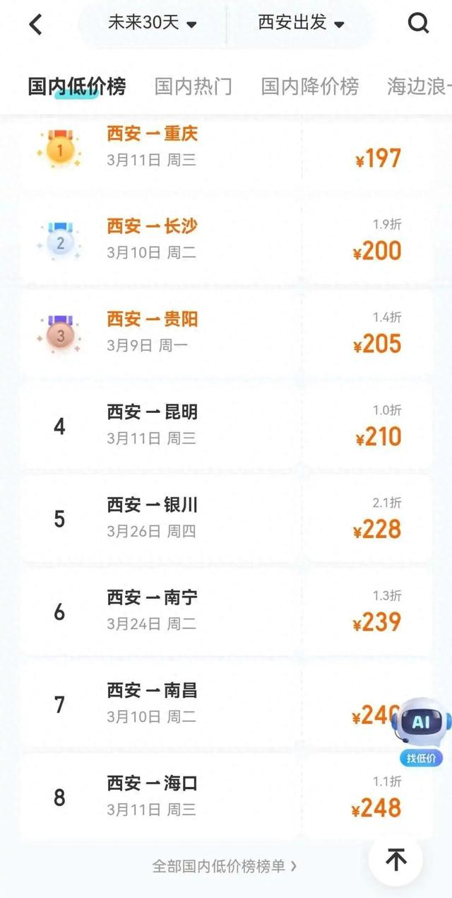 国内热门飞行目的地TOP10为: