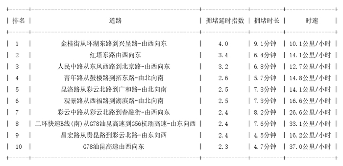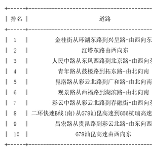 昆明道路拥堵排行榜top10: