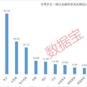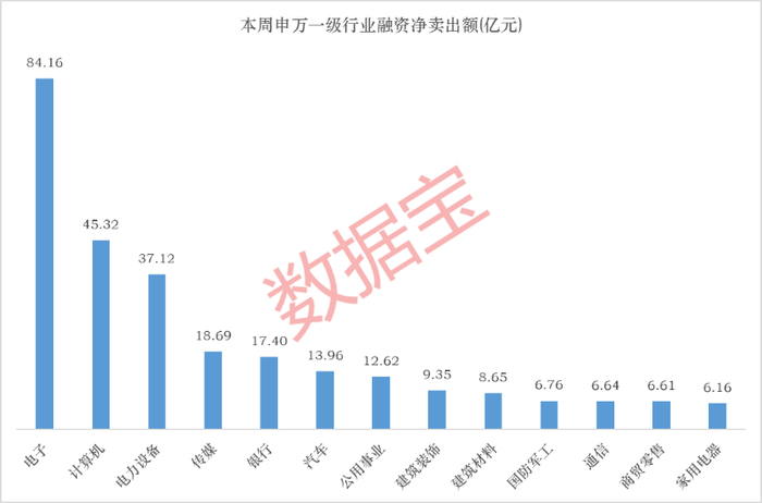 分行业来看。电子板块融资净卖出额居首,为84.16亿元;计算机、电力设备紧随其后,净卖出额分别为45.32亿元、37.12亿元;传媒、银行、汽车和公用事业净卖出额均在10亿元以上。