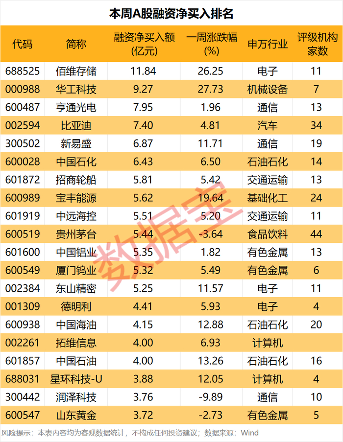 个股方面,本周27股融资净买入额在3亿元以上。佰维存储、华工科技、亨通光电、比亚迪净买入额在7亿元以上,其中佰维存储金额最高,为11.84亿元。