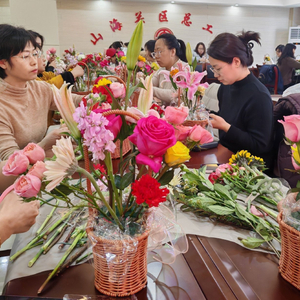 活动现场花香四溢,氛围温馨热烈。花艺师详细讲解插花艺术知识,逐一介绍玫瑰、百合、向日葵等花材的寓意与特点,并进行现场示范与步骤指导。在老师的耐心带领下,大家认真修剪、创意搭配,沉浸式体验插花乐趣。