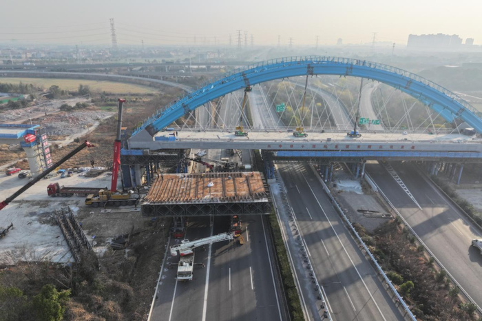 海宁2号特大桥是杭州机场高铁的重要组成部分。本次完工的1-112米系杆拱桥,采用“先梁后拱”工艺,桥面宽16.8米,浇筑混凝土总量达2230立方米,以112米大跨度一次跨越G92杭浦高速主线及盐官西枢纽匝道。该建设节点交通组织复杂、施工难度大、技术要求高,它的如期兑现最大限度降低了施工对高速路网运输效能的影响,对保障后续铺轨和全线通车具有重要意义。