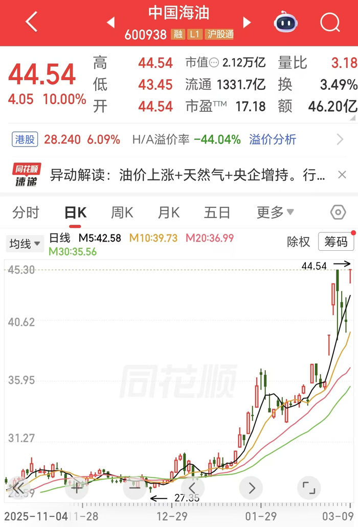 A股油气板块集体高开,中国海油股价创上市以来新高
