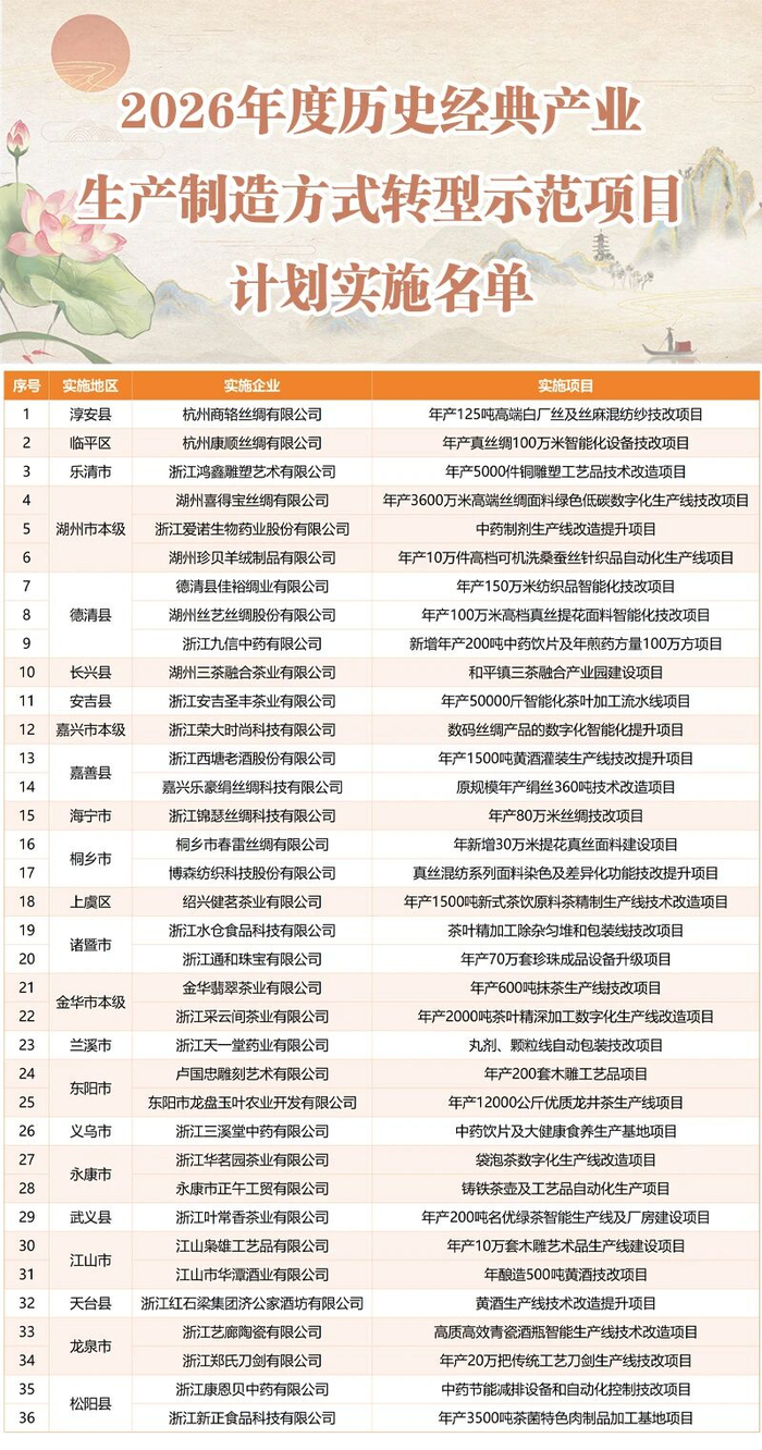 近日,2025年浙江省历史经典产业传承创新工作室名单和2026年度历史经典产业生产制造方式转型示范项目计划实施名单正式公布,分别有53家工作室和36个项目入选。
