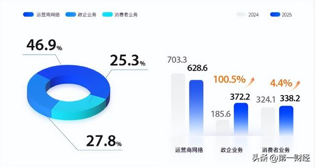 相比之下,运营商网络业务仍然是公司的基本盘。该业务全年实现收入628.6亿元,占总收入46.9%。虽然规模仍然最大,但增速已经明显放缓。