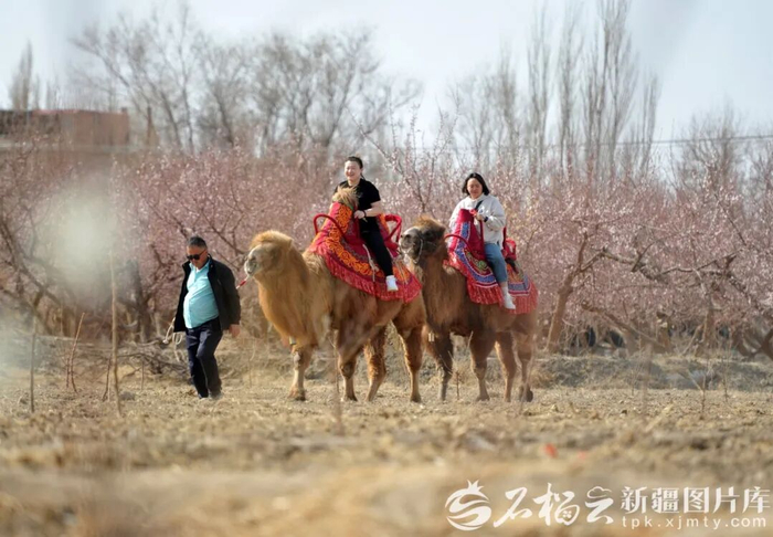 2025年3月21日,游客在托克逊县夏镇南湖村骑骆驼赏花(资料图片)。石榴云/新疆日报记者 秦梅花摄