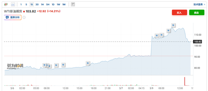 3月9日午后,WTI原油期货失守104美元/桶,日内涨幅收窄至14%。