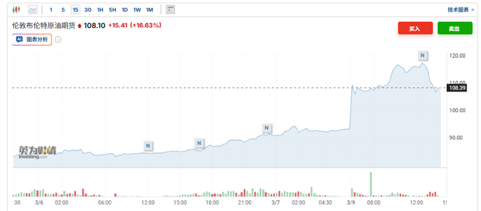布伦特原油期货日内涨幅收窄至16%,报108.1美元/桶。