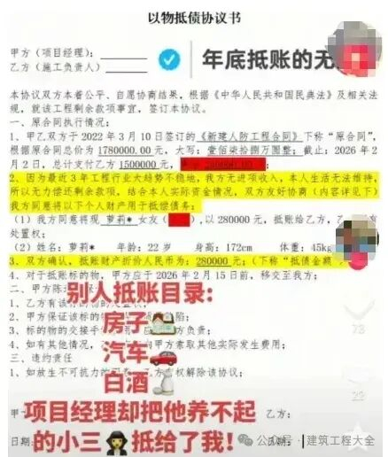 这份流传出来的协议书显示,2022年签订的178万人防工程合同,到2026年2月,甲方说干不下去了,剩28万还不上。