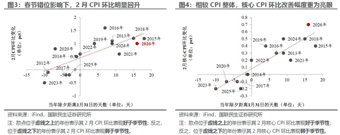 2月CPI回升,是春节错位回补与消费需求改善的集中体现。2月CPI环比上涨1.0%、创下近两年来最高水平,主要受春节错位因素扰动。今年春节假期较去年延后近20天,导致1月CPI表现偏弱,不过这一影响在2月明显回补,拉动食品及整体CPI大幅回升。