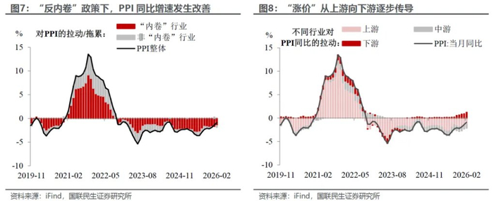 “反内卷”的政策效应正在落地生根。在大宗商品价格波动(尤其是油价上涨)及“反内卷”政策的积极作用下,PPI同比降幅进一步收窄至-0.9%(前值-1.4%)。一方面,“内卷”行业的价格延续修复态势;另一方面,上游“涨价”正逐步向下游传导,疏通价格传导链条。