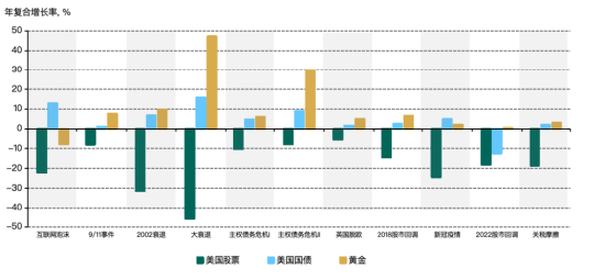 [12] 数据截至2025年12月31日。回报计算基于“全球股票”即富时全球指数、“美国国债”即彭博巴克莱美国国债指数以及“黄金”即LBMA午盘金价的美元回报。各事件日期——互联网泡沫:2000年3月至2001年3月;9/11事件:2001年9月11日;2002衰退:2002年3月至2002年7月;全球金融危机(即上图中“大衰退”):2007年10月至2009年2月;主权债务危机I:2010年1月至2010年6月;主权债务危机II:2011年2月至2011年10月;英国脱欧:2016年6月23日至2016年6月27日;2018股市回调:2018年10月至2018年12月;2020股市回调:2020年1月31日至2020年3月31日;2022股市回调:2022年1月至2022年12月,关税摩擦:2025年2月18日至2025年4月8日。来源:彭博社,ICE基准管理机构,世界黄金协会