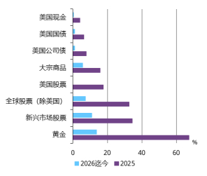 [1] 数据截至2026年2月17日,以美元计。所用指数:彭博美国国债指数、彭博美国公司债券指数、彭博大宗商品指数、MSCI美国指数、MSCI全球指数(除美国外)、MSCI新兴市场指数、LBMA午盘金价。来源:彭博社,ICE基准管理机构,世界黄金协会