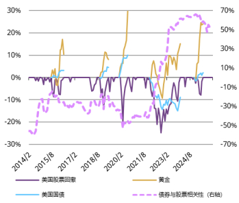 经历长期上涨后,当前市场估值已逼近互联网泡沫时期水平,此时若有个别公司盈利不及预期,便足以动摇市场信心。而这或将引发投资者去杠杆操作,可能放大股价下行风险,并推升市场对黄金等避险资产的需求。事实上,除少数例外情况,黄金在系统性风险时期往往表现亮眼,不仅能实现正回报,还能有效对冲投资组合的整体亏损。