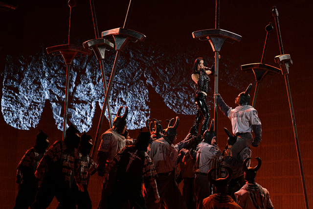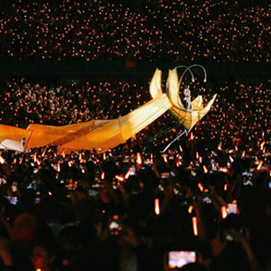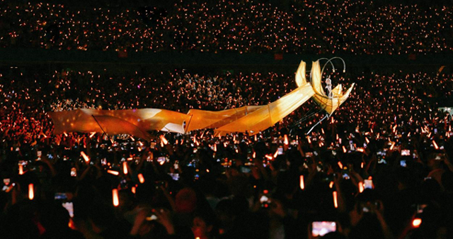 整场演唱会由多项巨型装置串联成完整世界观,每一件装置都并非是单纯的舞台背景,而是与表演深度融合的“角色”:悬于观众席上方的数十米“重剑”,瞬间带来极具冲击力的视觉震撼;更特邀来自江苏溧阳的一支专业特技团队加盟,将中国传统非遗“爬竿”杂技融入表演,刚劲利落的动作与“剑之丛林”完美结合,尽显东方力量之美;可自动翻页的巨型 “真相之书”,缓缓摊开她在爱情中的痴迷与成长;数十只飞马、大象鱼等奇幻生物绕场巡游,构建出一场超现实梦境;还有憨态可掬的山丘巨人温暖登场,自带治愈又快乐的感染力。蔡依林与舞者们环绕其间灵动互动,身姿轻盈俏皮如林间小精灵,轻松欢快的氛围拉满,将整场演出的愉悦与治愈感推向顶点。