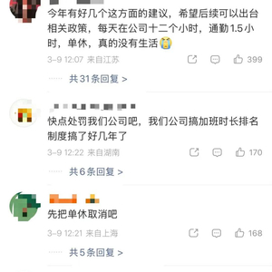 两会期间,代表委员们有关工时和加班的建议屡屡引发热议。9日上午,“建议处罚加班严重企业”“建议将8小时工作制缩短为7小时”两个话题登上微博热搜高位。