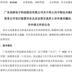 广东尚研电子科技股份有限公司(“尚研科技”)于2026年3月6日召开第二届董事会第二十次会议,审议通过《关于终止向不特定合格投资者公开发行股票并在北京证券交易所上市申请并撤回申请文件的议案》,公司拟终止本次公开发行股票并在北京证券交易所上市的申请,并撤回相关申请材料。