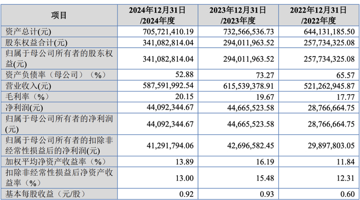 2022年度、2023年度、2024年度,公司营业收入分别为52,126.29万元、61,553.94万元和58,759.20万元;归母净利润分别为2,876.67万元、4,466.55万元和4,409.23万元;扣非归母净利润分别为2,989.78万元、4,269.66万元和4,129.18万元。