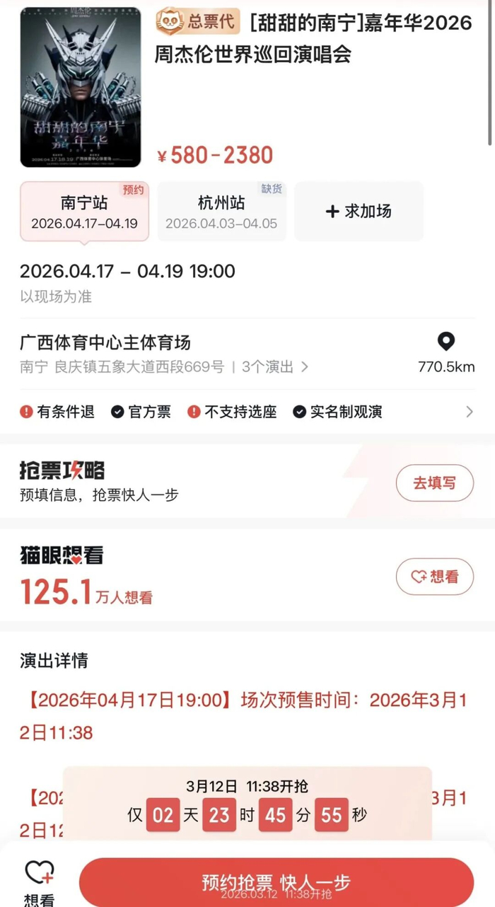3月9日,票务平台信息显示,2026周杰伦南宁演唱会门票预售时间确定,现在可预约抢票。