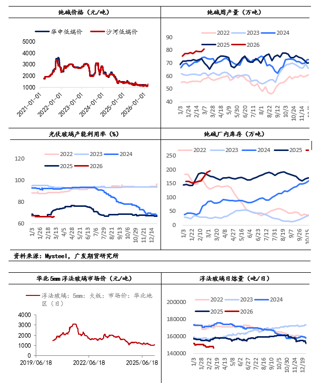 中期若宏观形势有所缓和,玻璃及纯碱进入传统旺季验证期,行情将回归基本面主导,核心变量为下游需求启动进度与产线检修情况。若下游需求带动库存有一定去化,同时高库存倒逼产线检修,盘面或迎来阶段性反弹;若需求启动不及预期,高库存压力将进一步释放,价格或将延续前期震荡偏弱格局。当前行情波动较大,建议以观望为主,待形势明朗后根据基本面变化情况参与,当前若参与建议轻仓并设置好止损点位。