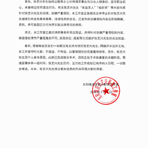 其次,本工作室已委托律师事务所依法取证,并将针对涉嫌严重侵权的内容,根据侵权情节严重程度的不同,采取诉讼、报案等方式维护张艺兴先生的合法权益。最后,感谢粉丝朋友们一如既往地支持与信任张艺兴先生。网络并非法外之地,本工作室呼吁大家:不造谣、不传谣,以客观理性的态度看待信息。另外,张艺兴先生因个人身体原因,此前已完成相关手术,目前正处于术后康复的关键阶段,需遵医嘱休养一段时间。张艺兴先生四月、五月的工作规划已有序纳入日程,一切稳步推进,未来,张艺兴先生将以更加优质的作品回馈大家的厚爱。