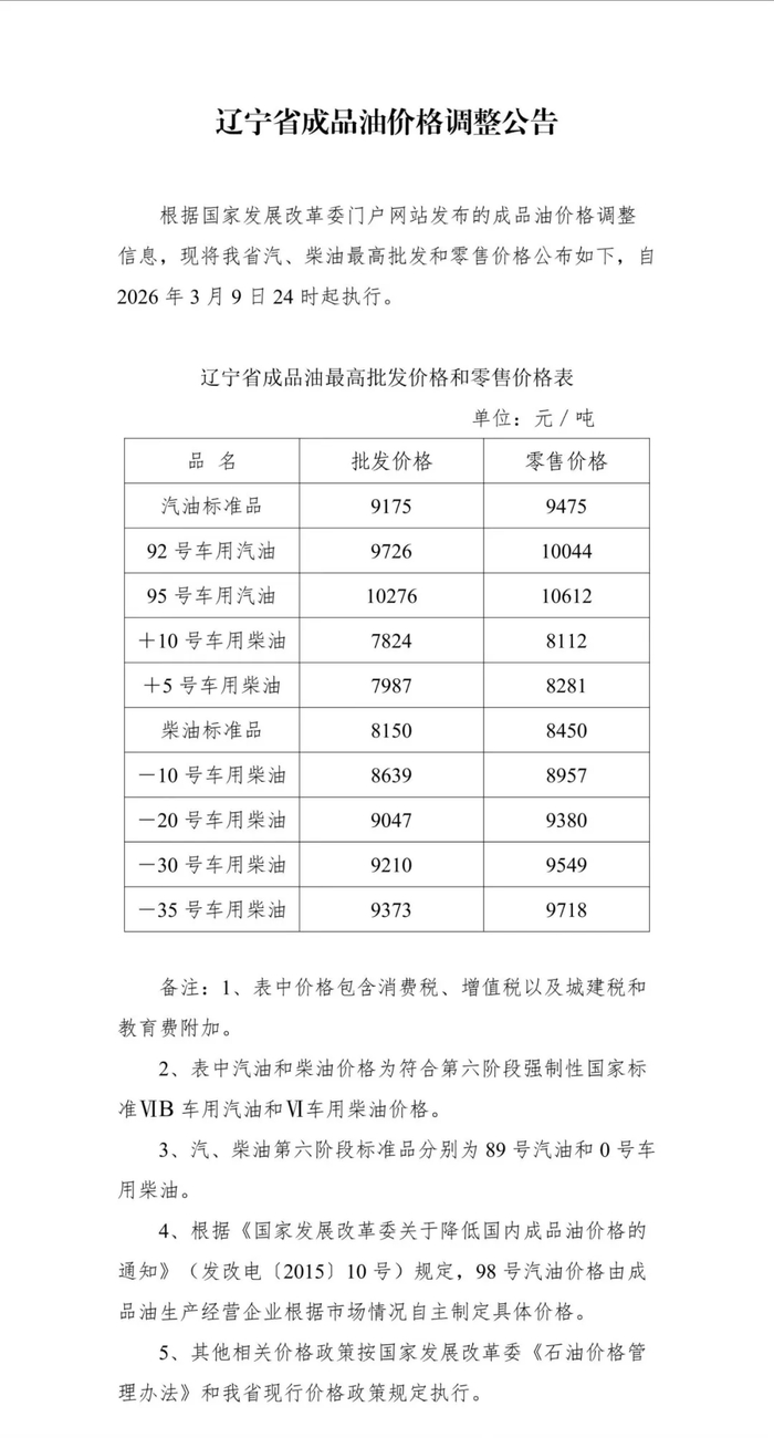 辽宁发布成品油价格调整公告