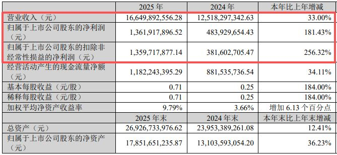 天赐材料(SZ002709,股价43.36元,市值881.9亿元)3月9日晚间披露2025年年报,公司2025年实现营收约166.5亿元,同比增长33%;实现归母净利润约13.62亿元,同比增长181.43%;实现扣非净利润约13.6亿元,同比增长256.32%;基本每股收益0.71元,同比增长184%。公司拟向全体股东每10股派发现金红利3元(含税),不送红股,不以公积金转增股本。