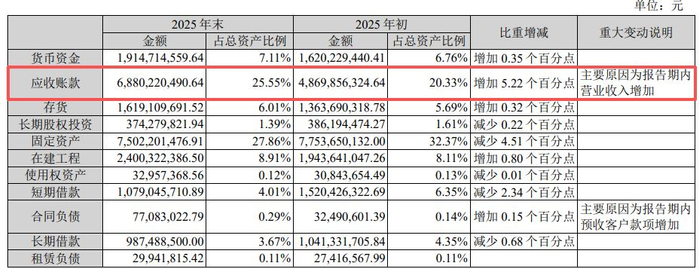 每经记者还注意到,截至2025年年末,天赐材料应收账款账面余额达68.8亿元,较2025年年初的48.7亿元增长41.28%,占总资产的比例增加了5.22个百分点。随着新能源汽车补贴政策的退坡,下游资金链压力可能传导至公司,带来一定的坏账和现金流风险。